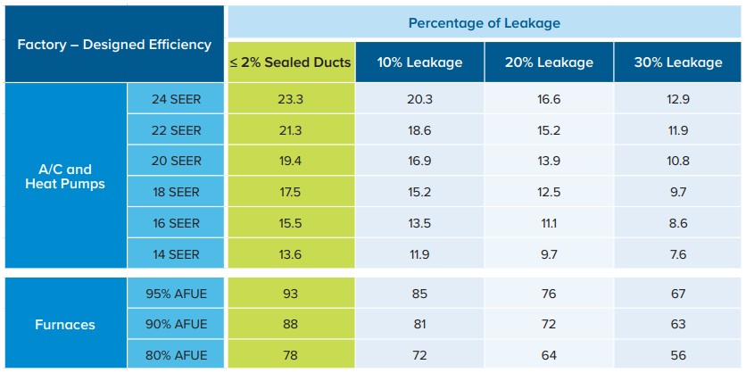 The U.S. Department of Energy reports the typical home may lose from 25 to 40% of its conditioned air due to leaky ducts. As a result, your furnace or AC unit works harder and longer, consumes much more energy, and wears out sooner.